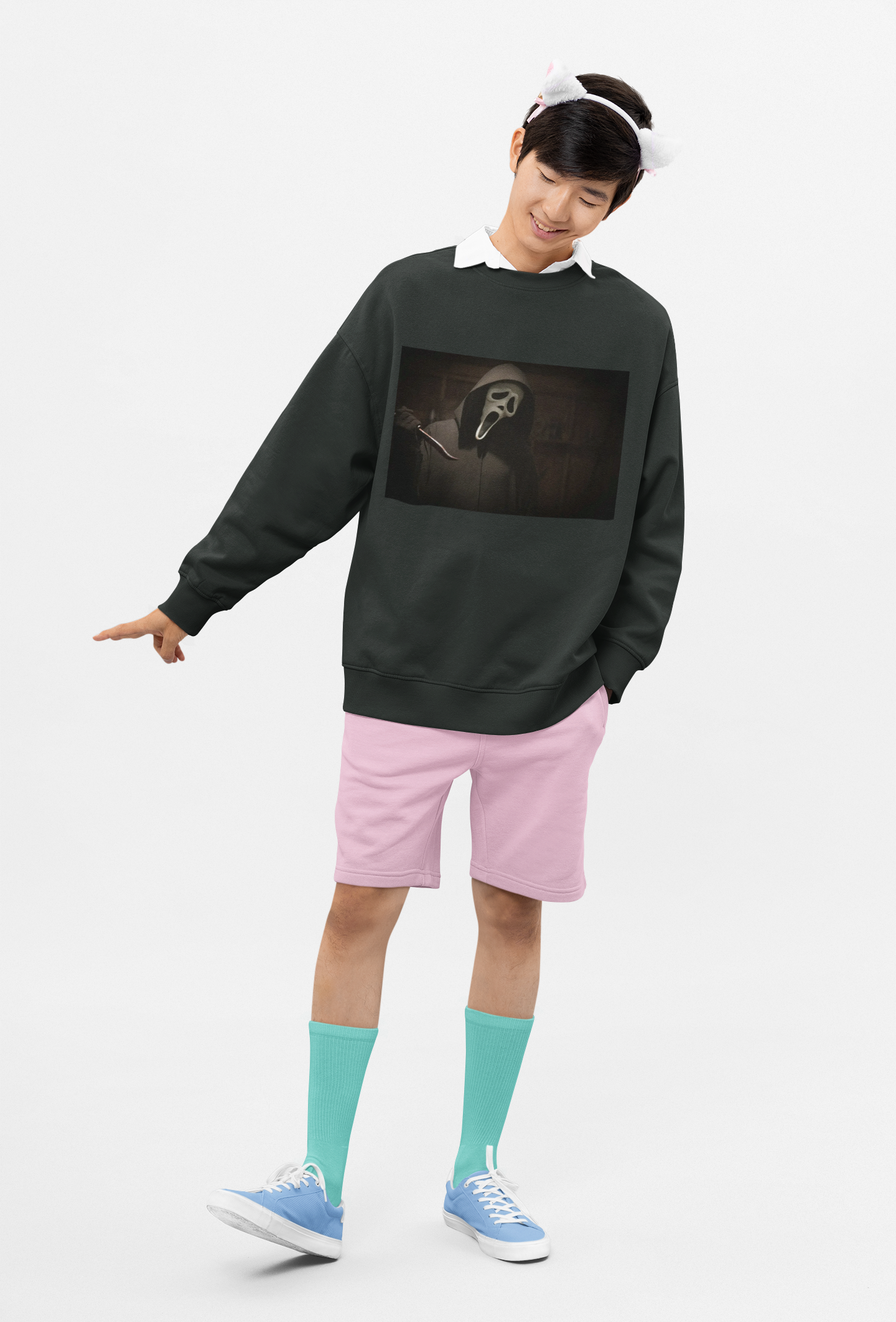 This oversized organic sweatshirt carries a quiet, eerie energy—soft and substantial, yet visually arresting. A dim, cinematic print of a masked figure sits centered on the chest, evoking late-night walks through foglit streets and whispered stories shared around low-lit gatherings. The brushed interior and heavyweight knit keep you warm without weighty stiffness, while the relaxed silhouette drapes easily over layers. Wear it on cool evenings when you want comfort that still feels expressive and a little mysterious.