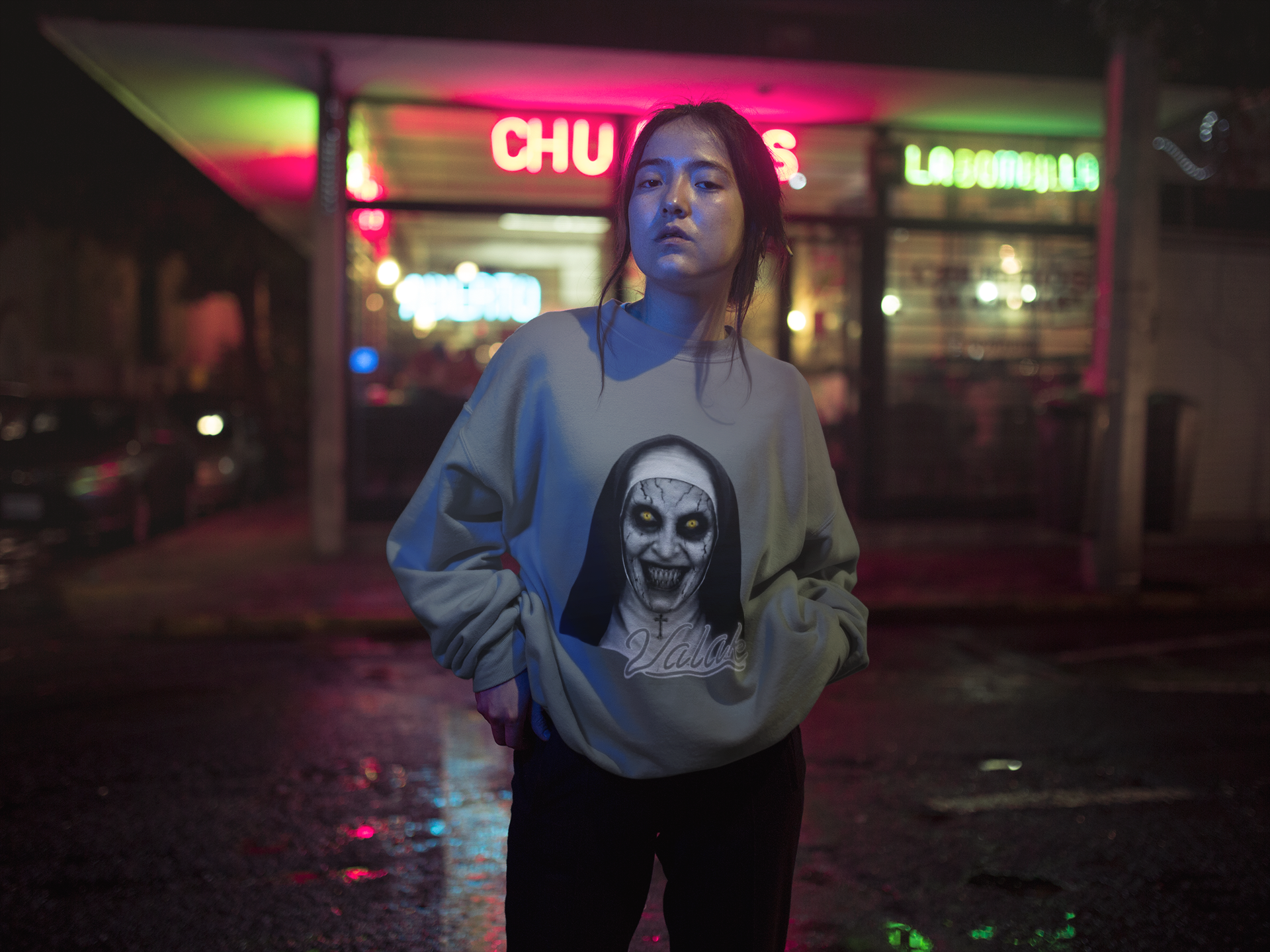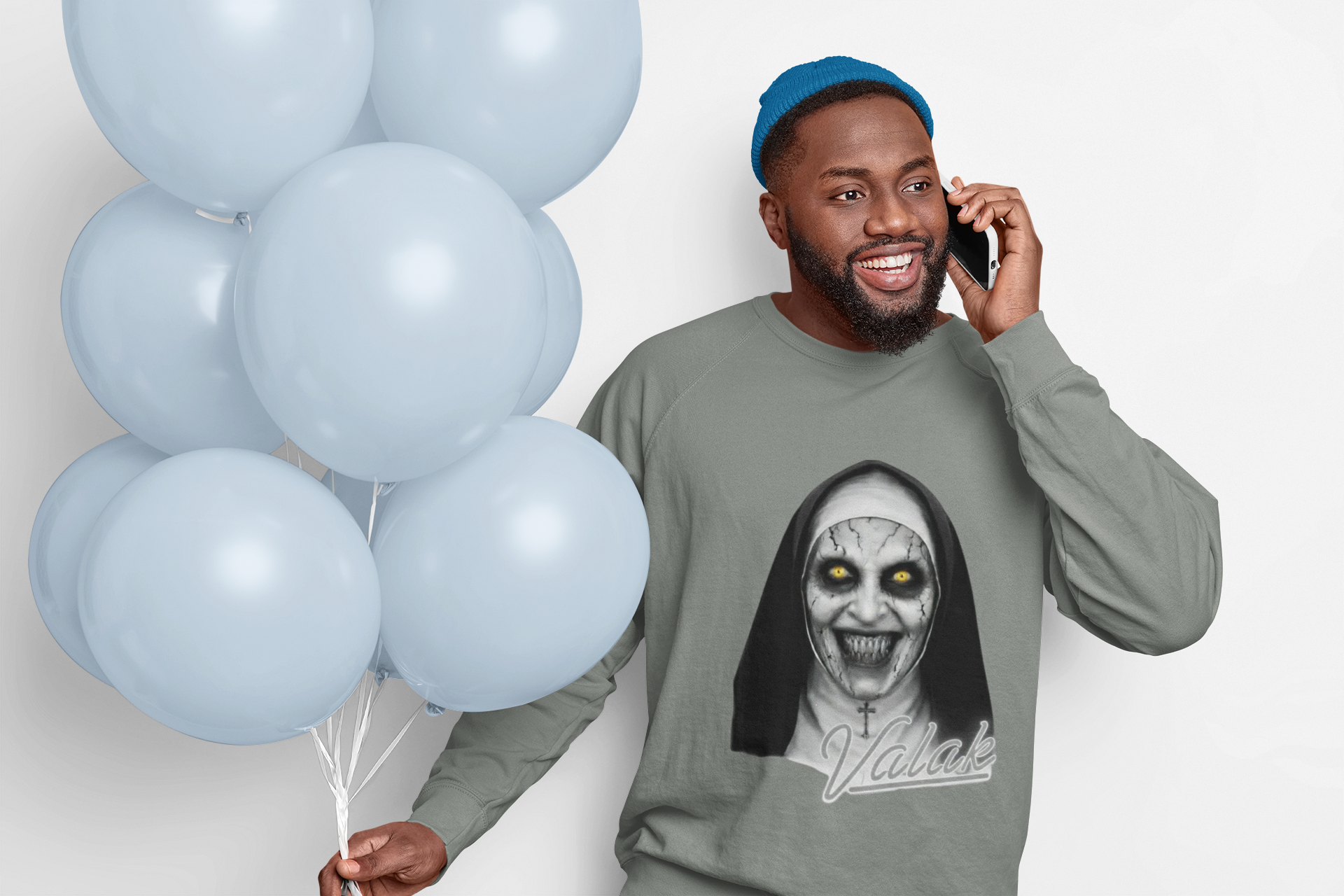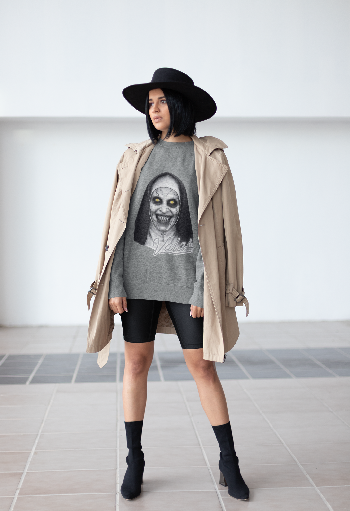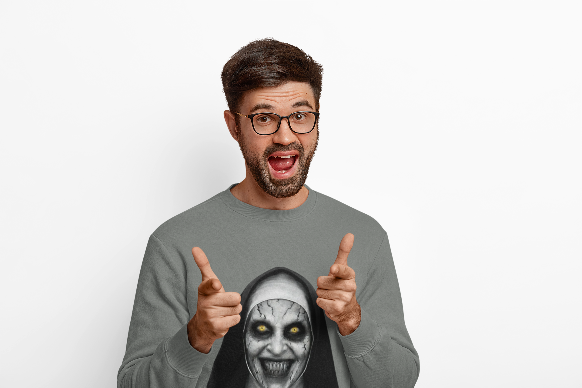 Late-night chills meet everyday comfort. This lightweight crewneck carries a haunting nun portrait with glowing eyes — a bold, eerie statement that slips into your rotation without weighing you down. The relaxed fit drapes easily over a tee or layered under a jacket. Wear it to haunted house runs, horror movie nights, or when you want a subtle scare on a city walk. The soft ring-spun cotton and clean tubular knit keep the silhouette smooth and simple, so the artwork takes center stage while you stay comfortable and ready for the next spooky plan.